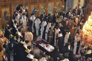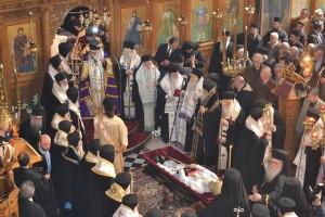 Εκατοντάδες πιστών, κληρικοί και μοναχοί κατέκλυσαν τον Μητροπολιτικό Ναό του Αγίου Βησσαρίωνος για να παρακολουθήσουν την εξόδιο ακολουθία η οποία τελέστηκε προεξάρχοντος του Αρχιεπισκόπου Αθηνών και πάσης Ελλάδος κ. Ιερώνυμου συμπαραστατούμενου πολλών Αρχιερέων της Ελληνικής Ορθόδοξης Εκκλησίας.