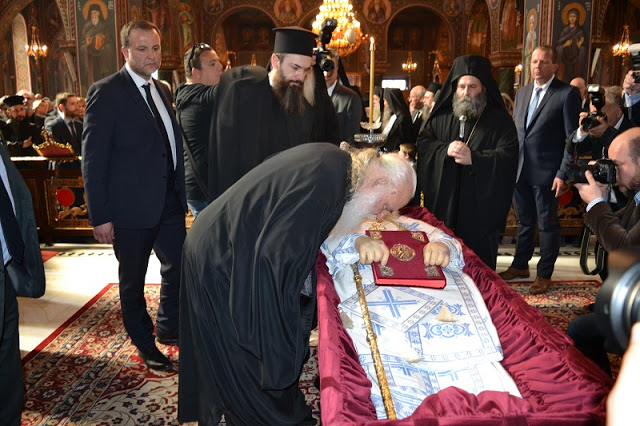 Ο Αρχιεπίσκοπος φθάνοντας στον Μητροπολιτικό Ναό κατευθύνθηκε και προσκύνησε στο σκήνωμα του μακαριστού κυρού Σεραφείμ και ακολούθησε η εξόδιος ακολουθία μετά το πέρας της οποίας τον αποχαιρέτησαν ο Γραμματέας της Ιεράς Συνόδου της Εκκλησίας της Ελλάδος Αρχιμανδρίτης Κλήμης ο οποίος αναφέρθηκε στην προσωπικότητα και τον άριστο χαρακτήρα του Σεβάσμιου Ποιμενάρχη το έργο του οποίου είναι τεράστιο και αναγνωρίζουν άπαντες εκφράζοντας τη βεβαιότητα ότι ο Κύριος τον έχει ήδη κατατάξει εν σκηνές δικαίων.