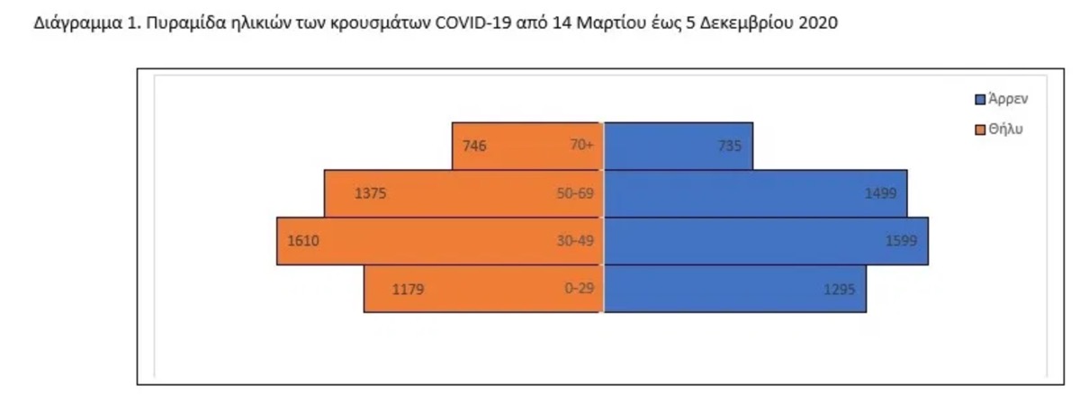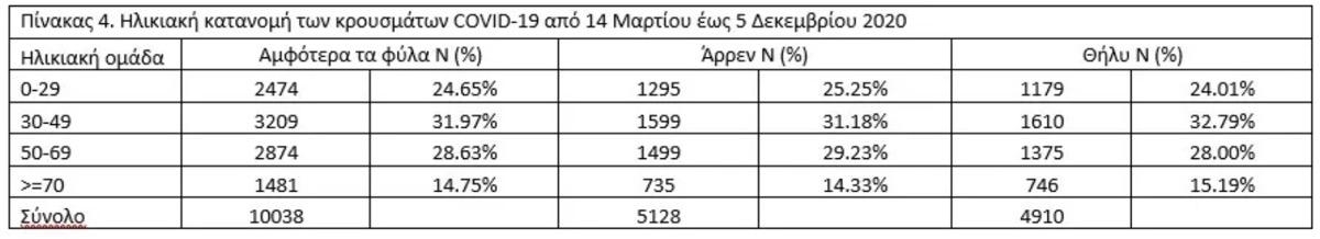 Χρησιμοποιήθηκαν τέσσερις ηλικιακές ομάδες για να παρουσιαστεί η ηλικιακή κατανομή των κρουσμάτων. Η πλειοψηφία των κρουσμάτων στο σύνολο των δύο φύλων και σε κάθε φύλο ξεχωριστά εντοπίζεται στην ηλικιακή ομάδα “30-49” . Η ηλικιακή κατανομή των επιβεβαιωμένων κρουσμάτων παρουσιάζεται στον Πίνακα 4 και στο Διάγραμμα 1.