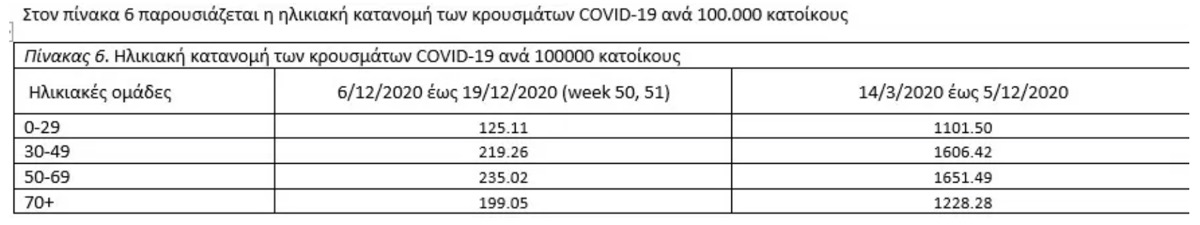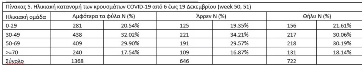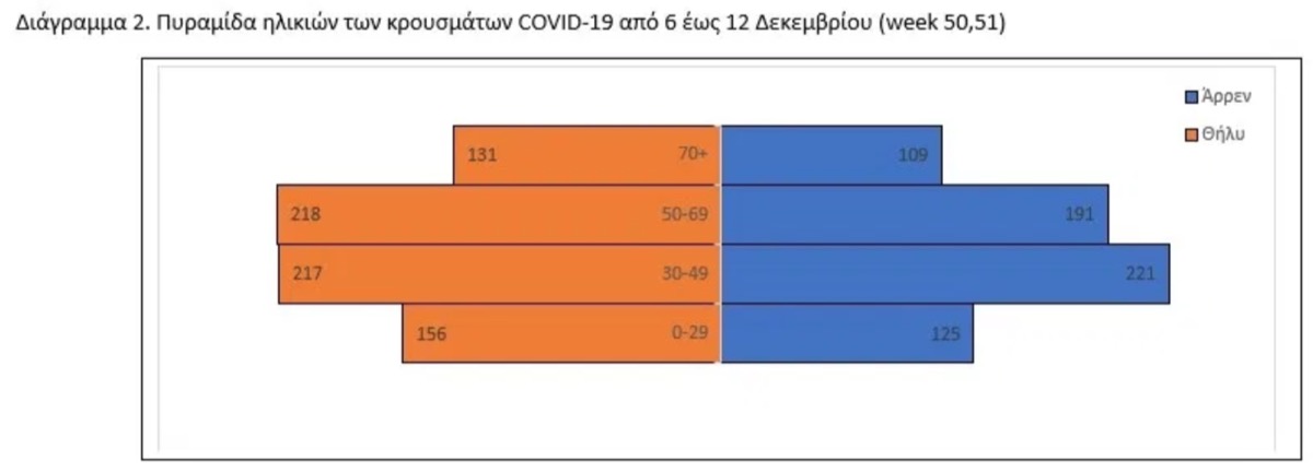 Η πλειοψηφία των κρουσμάτων στους άντρες εντοπίζεται στην ηλικιακή ομάδα “30-49” και στις γυναίκες στην ηλικιακή ομάδα είναι η “50-69” για τις εβδομάδες με ημερομηνίες από 6 έως 19 Δεκεμβρίου (week 50, 51). Η ηλικιακή κατανομή των επιβεβαιωμένων κρουσμάτων των δύο τελευταίων εβδομάδων παρουσιάζεται στον Πίνακα 5 και στο Διάγραμμα 2.