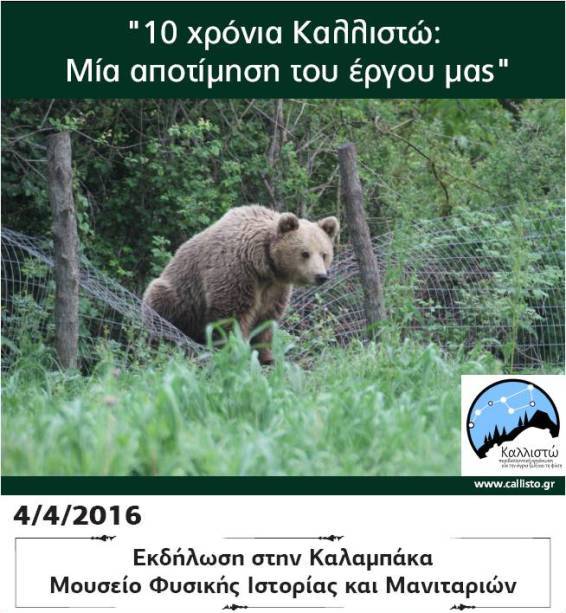 Στο πλαίσιο του έργου «10 χρόνια Καλλιστώ: Ενδυνάμωση Δομών και Εφαρμογή Αρχών Λογοδοσίας» η Περιβαλλοντική Οργάνωση Καλλιστώ πραγματοποιεί σειρά εκδηλώσεων σε 7 πόλεις της Ελλάδας όπου θα πραγματοποιήσει έναν δημόσιο απολογισμό της μέχρι τώρα πορείας της. Η επόμενη εκδήλωση έχει προγραμματιστεί για την Καλαμπάκα στην Δευτέρα 4 Απριλίου 2016 στον χώρο του Μουσείου Φυσικής Ιστορίας και Μανιταριών, στις 19:00.