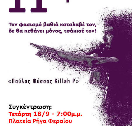 Όλες και όλοι στη συγκέντρωση μνήμης και τιμής στον Παύλο Φύσσα, στην αντιφασιστική, αντιρατσιστική, αντικυβερνητική συγκέντρωση στην πλατεία Ρήγα Φεραίου, την Τετάρτη 18 Σεπτέμβρη στις 7 μ.μ.