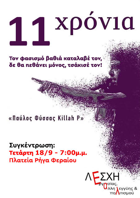 Όλες και όλοι στη συγκέντρωση μνήμης και τιμής στον Παύλο Φύσσα, στην αντιφασιστική, αντιρατσιστική, αντικυβερνητική συγκέντρωση στην πλατεία Ρήγα Φεραίου, την Τετάρτη 18 Σεπτέμβρη στις 7 μ.μ.