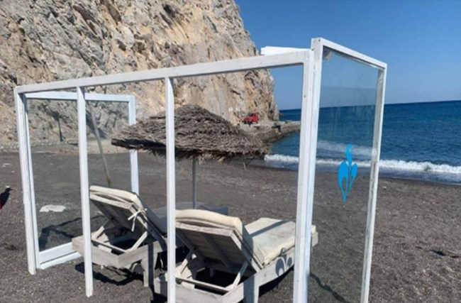 “Έχουμε φτιάξει μια κατασκευή με πλεξιγκλάς που το είδαμε από το εξωτερικό. Είναι ένας χώρος ανά δύο ξαπλώστρες και με απόσταση 4 μέτρων το ένα σετ ξαπλώστρας από το άλλο. Έχουμε αντισηπτικά και απολύμανση και θα κάνουμε συνεχή αλλαγή πετσέτας μιας χρήσης και στρωμάτων. Πιστεύουμε ότι έτσι θα μπορέσουμε να λειτουργήσουμε”, δηλώνει ο Ιταλός Charlie Chahine, μόνιμος κάτοικος και ιδιοκτήτης επιχειρήσεων στο νησί της Σαντορίνης που αποφάσισε να δημιουργήσει αυτή την κατασκευή από πλέξιγκλας στο beach bar “Demilmar” στην Μαύρη Παραλία στην Περίσσα.