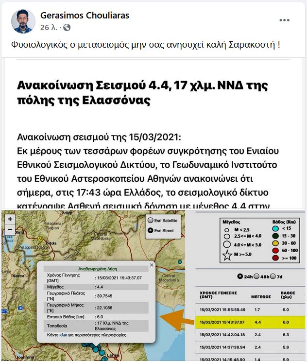 trikaladay.gr / Θεσσαλία / Τι έγραψε ο σεισμολόγος Γερ. Χουλιάρας για το νέο μετασεισμό της Καθαράς Δευτέρας