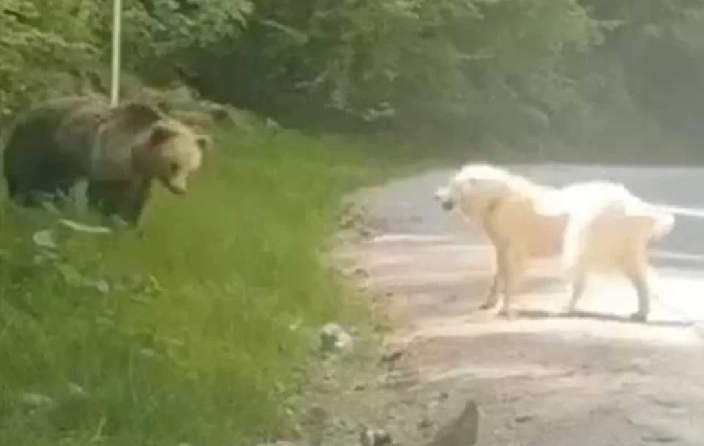 Στο βίντεο βλέπουμε την αρκούδα να κάνει μια κίνηση να επιτεθεί, αλλά στο τέλος να οπισχθοχωρεί. Ο λευκός ποιμενικός είναι θαρραλέος μέχρι το τέλος. Παραμένει στη θέση του, γαβγίζει και τελικά αναγκάζει την καφέ αρκούδα να επιστρέψει στο δάσος, από όπου είχε κατέβει για αναζήτηση τροφής.
