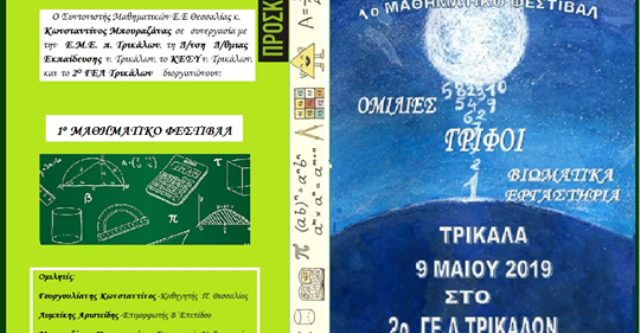 Το Μαθηματικό Φεστιβάλ οργανώνεται με πρωτοβουλία του Συντονιστή Εκπαιδευτικού Έργου Μαθηματικών Θεσσαλίας κ. Κωνσταντίνου Μπουραζάνα σε συνεργασία με τη Διεύθυνση Δευτεροβάθμιας Τρικάλων την Ελληνική Μαθηματική Εταιρεία – Παράρτημα Τρικάλων, το ΚΕΣΥ ν. Τρικάλων και το 2ο Γενικό Λύκειο, την Πέμπτη 9 Μαΐου στους χώρους του 2ου Γενικού Λυκείου Τρικάλων.