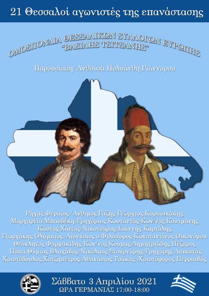 Ελάτε σε ένα μάθημα ελληνικής ιστορίας, να γνωρίσουμε 21 θεσσαλούς ήρωες και αγωνιστές των επαναστατικών χρόνων που ξεσηκώθηκαν άλλοι με τα άρματα κι άλλοι με την πένα, για να ελευθερώσουν την πολυαγαπημένη πατρίδα. Γιατί όποιος μαθαίνει το παρελθόν, διδάσκεται για το μέλλον. Χρέος μας η ευγνωμοσύνη στους επώνυμους αλλά και αφανείς αγωνιστές!