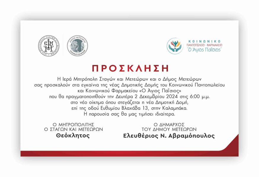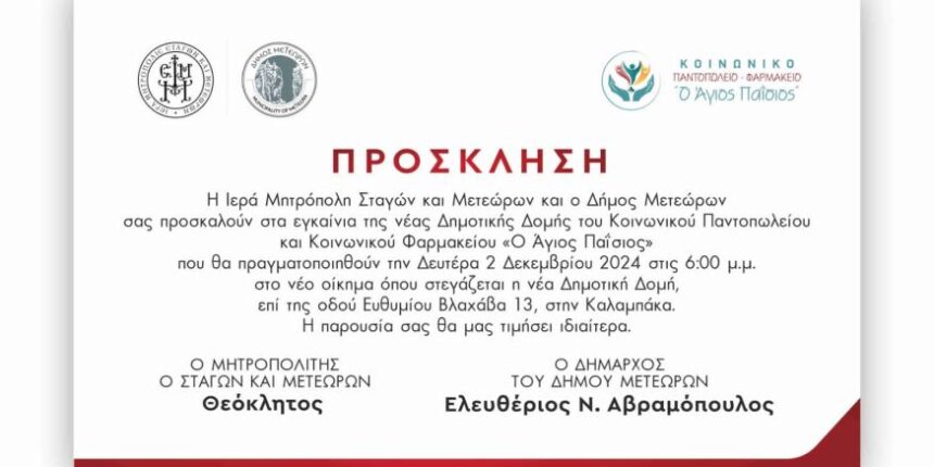 Η Μητρόπολη Σταγών και Μετεώρων εγκαινιάζουν την Δευτέρα 2 Δεκεμβρίου 2024 το κοινωνικό παντοπωλείο και φαρμακείο “Αγιος Παίσιος”