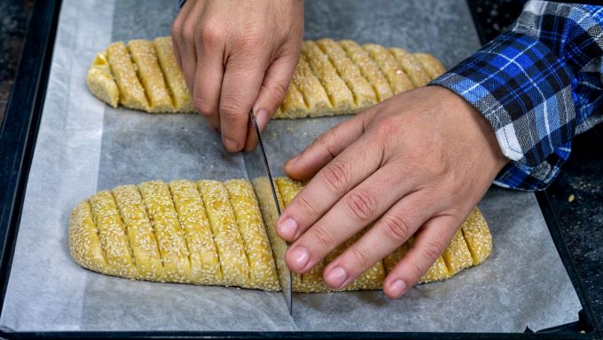 - Χαράζουμε διαγώνια με ένα μαχαίρι χωρίς να κόψουμε σε ίση απόσταση 1,5 εκ.