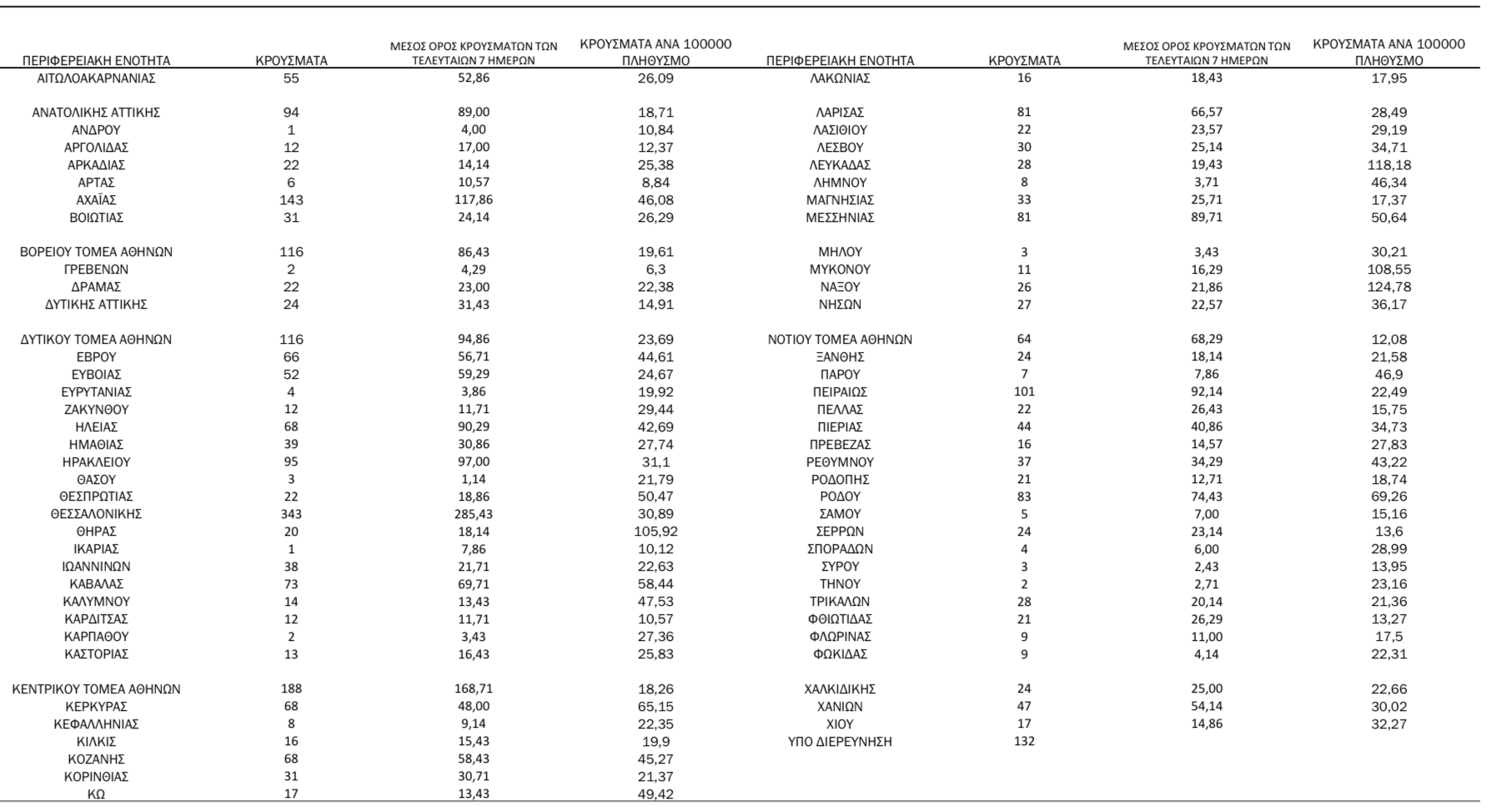 Ο ΕΟΔΥ ανακοίνωσε ότι τα νέα εργαστηριακά επιβεβαιωμένα κρούσματα κορωνοϊού που καταγράφηκαν τις τελευταίες 24 ώρες είναι 3.064 , εκ των οποίων 28 εντοπίστηκαν κατόπιν ελέγχων στις πύλες εισόδου της χώρας. Στη Λάρισα τα νέα κρούσματα ανήλθαν σε 81. Ο συνολικός αριθμός των κρουσμάτων ανέρχεται σε 579.734 (ημερήσια μεταβολή +0.5%), εκ των οποίων 51.1% άνδρες.