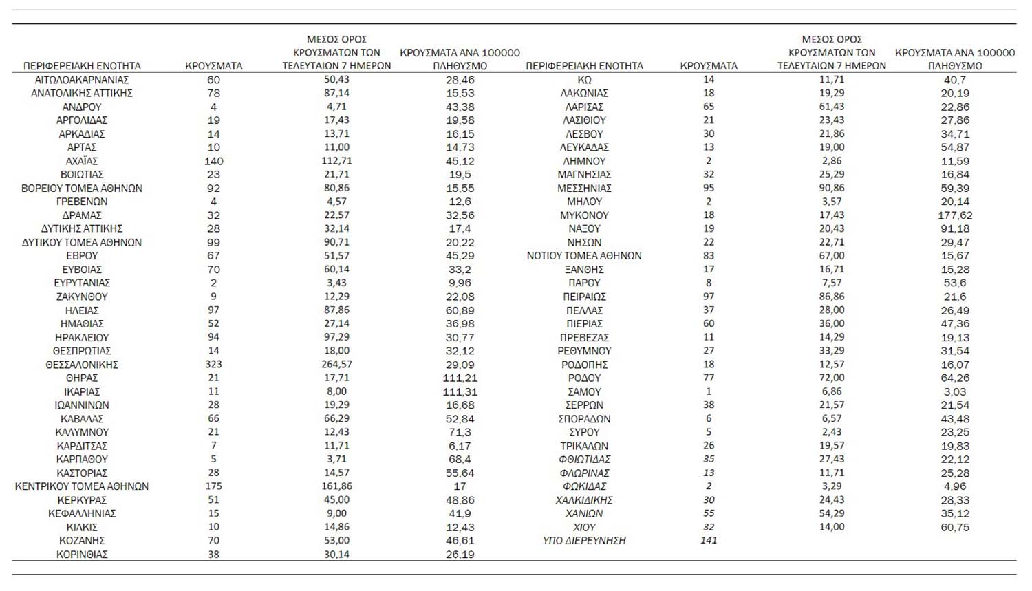 Ο συνολικός αριθμός των κρουσμάτων ανέρχεται σε 576.672 (ημερήσια μεταβολή +0.5%), εκ των οποίων 51.1% άνδρες.1 Με βάση τα επιβεβαιωμένα κρούσματα των τελευταίων 7 ημερών, 217 θεωρούνται σχετιζόμενα με ταξίδι από το εξωτερικό και 1.794 είναι σχετιζόμενα με ήδη γνωστό κρούσμα.