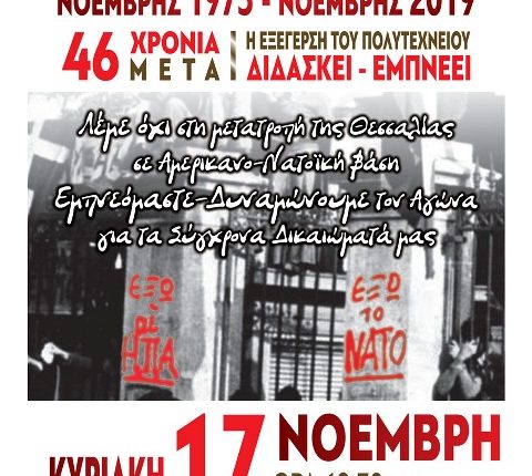 Το κάλεσμα της Επιτροπής Ειρήνης Τρικάλων για το γιορτασμό του Πολυτεχνείου αναφέρει τα εξής: