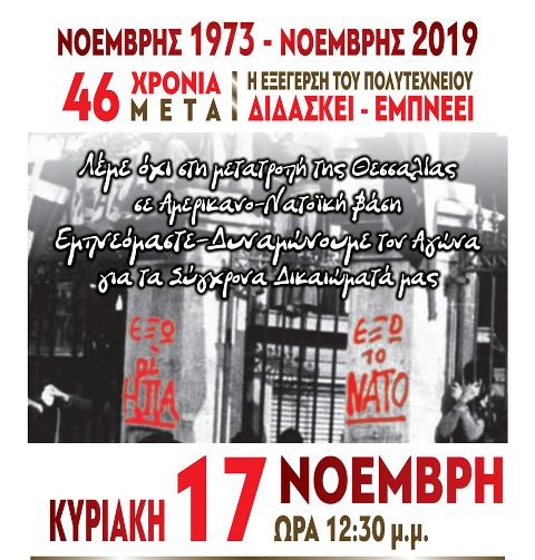 Όλοι εµείς οι εργαζόμενοι , συνταξιούχοι , άνεργοι , νέοι που βρισκόμαστε στο δρόμο του αγώνα για να μη μετατρέπει η περιοχή μας και όλη τη χώρα σε ένα απέραντο Αμερικανονατοϊκό στρατόπεδο , εµπνεόµαστε και παίρνουµε δύναµη από τα διδάγµατα του ξεσηκωµού του Πολυτεχνείου.