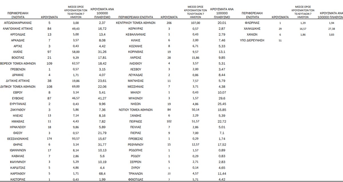 Σήμερα ανακοινώνουμε 1526 νέα κρούσματα της λοίμωξης του νέου κορωνοϊού (COVID-19), εκ των οποίων 9 εντοπίστηκαν κατόπιν ελέγχων στις πύλες εισόδου της χώρας. Ο συνολικός αριθμός των κρουσμάτων ανέρχεται στα 166067, εκ των οποίων 51.9% άνδρες. Κατά την ιχνηλάτιση βρέθηκε ότι 6061 (3.6%) θεωρούνται σχετιζόμενα με ταξίδι από το εξωτερικό και 52913 (61.0%) είναι σχετιζόμενα με ήδη γνωστό κρούσμα.