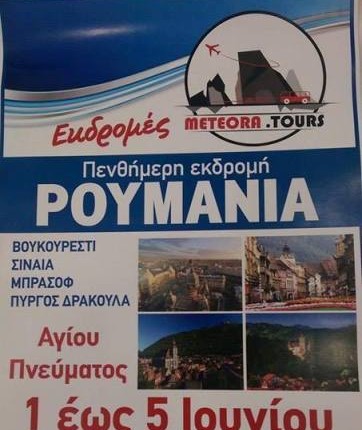 5νθήμερη εκδρομή από την 1η έως τις 5 Ιουνίου στη Ρουμανία διοργανώνει το τουριστικό γραφείο των Τρικάλων Meteora Tours.