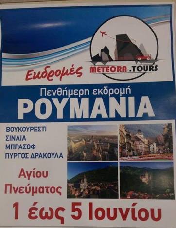 5νθήμερη εκδρομή από την 1η έως τις 5 Ιουνίου στη Ρουμανία διοργανώνει το τουριστικό γραφείο των Τρικάλων Meteora Tours.