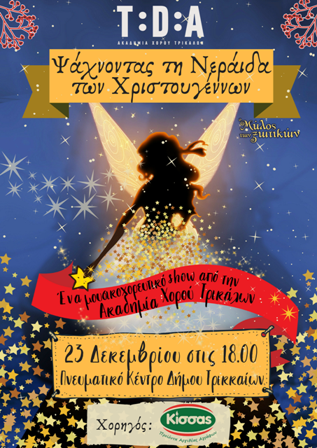 Και φυσικά το μεγάλο χριστουγεννιάτικο show της σχολής την ίδια μέρα έρχεται να μας συναρπάσει! Συγκεκριμένα στις 18.00 το απόγευμα της 23ης Δεκεμβρίου θα παρακολουθήσουμε στο πνευματικό κέντρο του Δήμου με ελεύθερη είσοδο ένα φαντασμαγορικό show σε χριστουγεννιάτικες νότες με πολύ χορό αλλά και τραγούδι! ‘ψάχνοντας τη νεράιδα των Χριστουγέννων’ ο τίτλος της παράστασης της Ακαδημίας Χορού Τρικάλων. Μια χριστουγεννιάτικη ιστορία με πολύ χιούμορ και όλους τους αγαπημένους μας ήρωες των Χριστουγέννων πάνω στη σκηνή! Πάνω από 250 χορευτές όλων των ηλικιών ερασιτέχνες αλλά και επαγγελματίες θα μας μεταφέρουν σε ένα μαγικό κόσμο απόγευμα του Σαββάτου. Συμμετέχουν και οι cheerleaders του αθλητικού συλλόγου Τρικάλων Εύαθλοι.