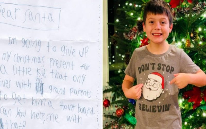 Όταν, λοιπόν, ο μικρός Hudson το έμαθε, αποφάσισε να γράψει και ο ίδιος ένα γράμμα ζητώντας προσωπικά αυτή τη χάρη. Του έγραψε: «Δίνω το Χριστουγεννιάτικο δώρο μου σε ένα μικρό παιδί που ζει μόνο με τους παππούδες του και θέλει και εκείνο ένα hoverboard. Μπορείς να με βοηθήσεις με αυτό;»