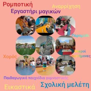 Μια νέα συναρπαστική χρονιά δημιουργικής απασχόλησης ετοιμάζεται μεθοδικά βασισμένη σένα ολοκληρωμένο εκπαιδευτικό σχέδιο ποικίλων δραστηριοτήτων, στοχοθετώντας κατευθείαν στη σωματική και πνευματική πρόοδο των παιδιών.