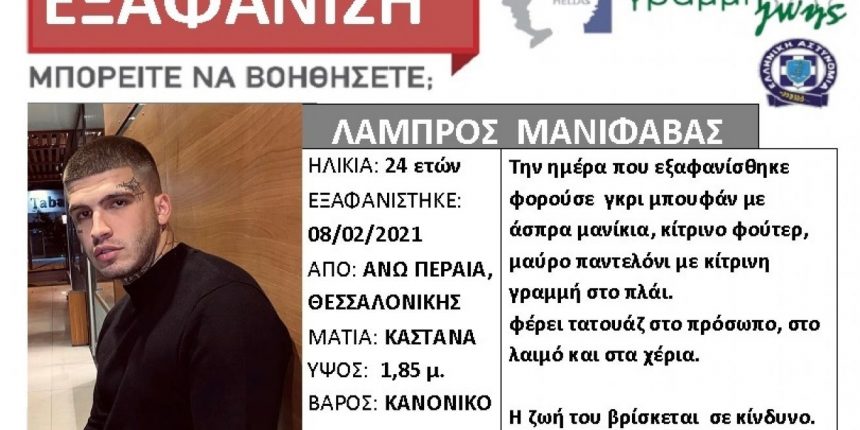 Ο 24χρονος εξαφανίστηκε από το σπίτι του τη Δευτέρα 8 Φεβρουαρίου 2021 στην περιοχή Ραντάρ, στην Άνω Περαία Θεσσαλονίκης. Έχει καστανά μάτια, ύψος 1,85m. και είναι κανονικού βάρους. Την ημέρα που εξαφανίστηκε φορούσε γκρι μπουφάν με άσπρα μανίκια, κίτρινο φούτερ και μαύρο παντελόνι με κίτρινη γραμμή στο πλάι. Φέρει τατουάζ στο πρόσωπο, στο λαιμό και στα χέρια. Η Γραμμή Ζωής, ειδοποιήθηκε από τους συγγενείς του την 10/02/2021 και μετά τη συγκέντρωση των απαιτούμενων δικαιολογητικών, ενεργοποιεί τον Κοινωνικό Συναγερμό SILVER ALERT, για την κινητοποίηση όλων για την ανεύρεσή του. Η ζωή του βρίσκεται σε κίνδυνο.