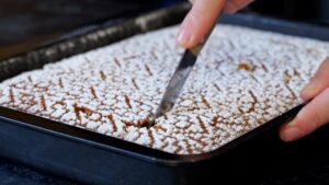- Σε μια αλευρολαδωμένη φόρμα 25χ30 εκ. ρίχνουμε το μείγμα και το ψήνουμε σε προθερμασμένο φούρνο στις αντιστάσεις στους 170 βαθμούς για 1 ώρα στη κάτω σχάρα.