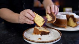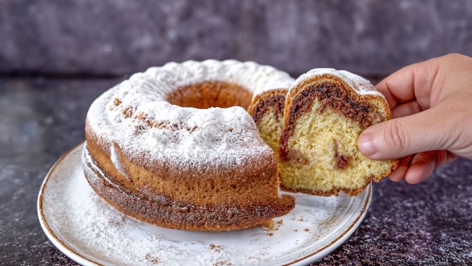 - Αφήνουμε το κέικ να κρυώσει και έπειτα το πασπαλίζουμε με ζάχαρη άχνη.