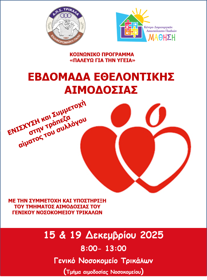 2. Την Κυριακή 21/12/2025, ο ΑΠΣ Τρίκαλα, τα ΚΔΑΠ ΜΑΘΗΣΗ, την Μονάδα Πρόληψης του
