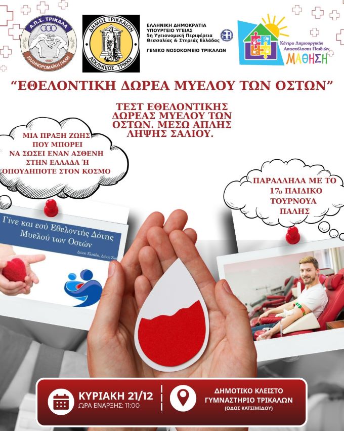 Γυμναστήριο Τρικάλων (οδός Κατσιμήδου), ώρα έναρξης 10:00-14:00 (στα πλαίσια