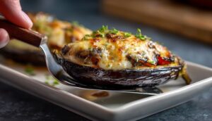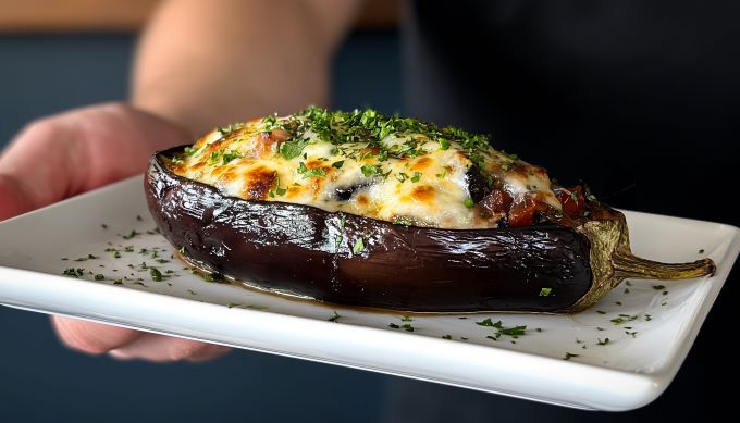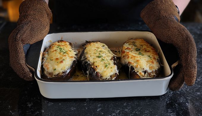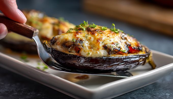 - Γεμίζουμε τις μελιτζάνες, τρίβουμε το Κασέρι ΟΛΥΜΠΟΣ πάνω από κάθε μελιτζάνα και ξανά ψήνουμε για ακόμη 15-20 λεπτά στους 200°C .