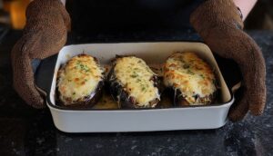 - Κόβουμε προσεκτικά τα καπάκια από τις μελιτζάνες για να δημιουργήσουμε μια θήκη.