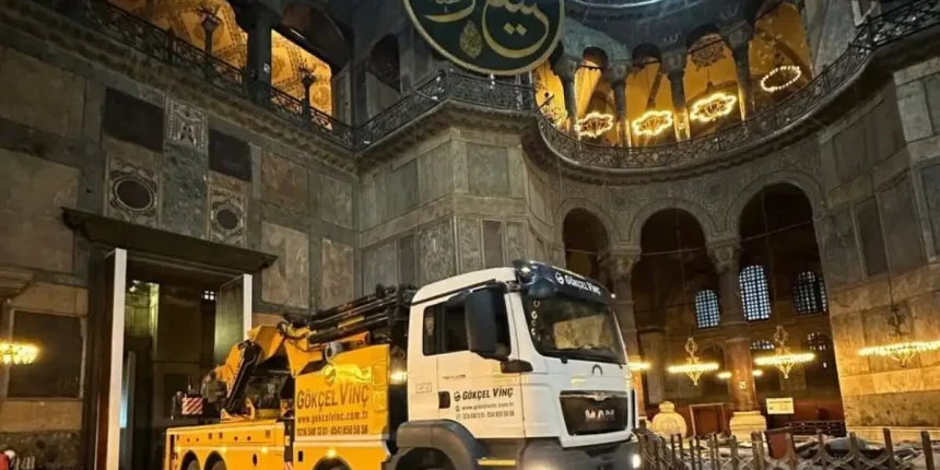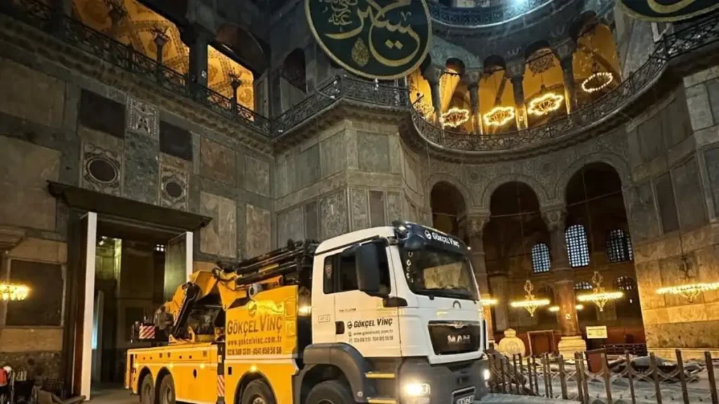 Η εμφάνιση βαρέων γερανοφόρων φορτηγών μέσα στην Αγία Σοφία προκαλεί ανησυχίες σχετικά με τον τρόπο που πραγματοποιείται η τελευταία φάση των εργασιών αποκατάστασης, τόσο σε μέσα της Ελλάδας, αλλά και στην Τουρκία.