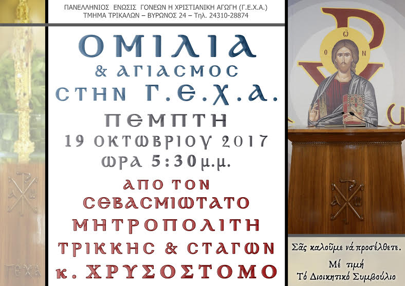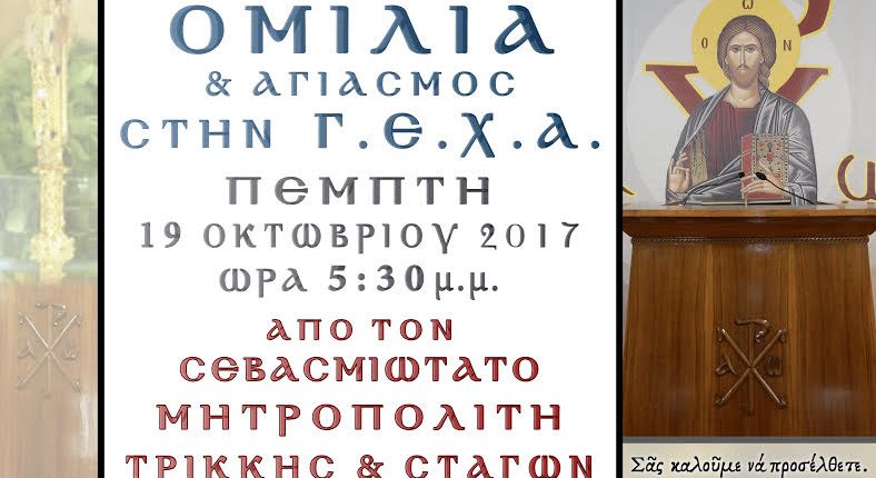 Την Πέμπτη ​19 Οκτωβρίου και ώρα 5.30 μ.μ. αρχίζουν οι εσπερινές ομιλίες στην αίθουσα της Γ.Ε.Χ.Α. Τρικάλων, οδός Βύρωνος 24.