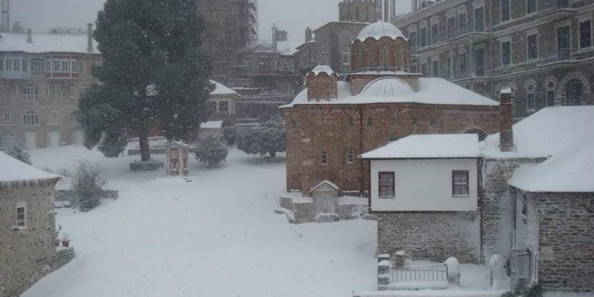 Πυκνές χιονοπτώσεις σημειώνονται ακόμα και σε παράκτιες περιοχές του Αγίου Όρους από το βράδυ της Κυριακής στην Αθωνική Πολιτεία. Προβλήματα παρουσιάζονται σε όλο το οδικό δίκτυο της Αθωνικής χερσονήσου, ενώ την Κυριακή δεν πραγματοποιήθηκαν τα δρομολόγια των πλοίων από Ιερισσό και Ουρανούπολη, καθώς ίσχυε απαγορευτικό απόπλου.