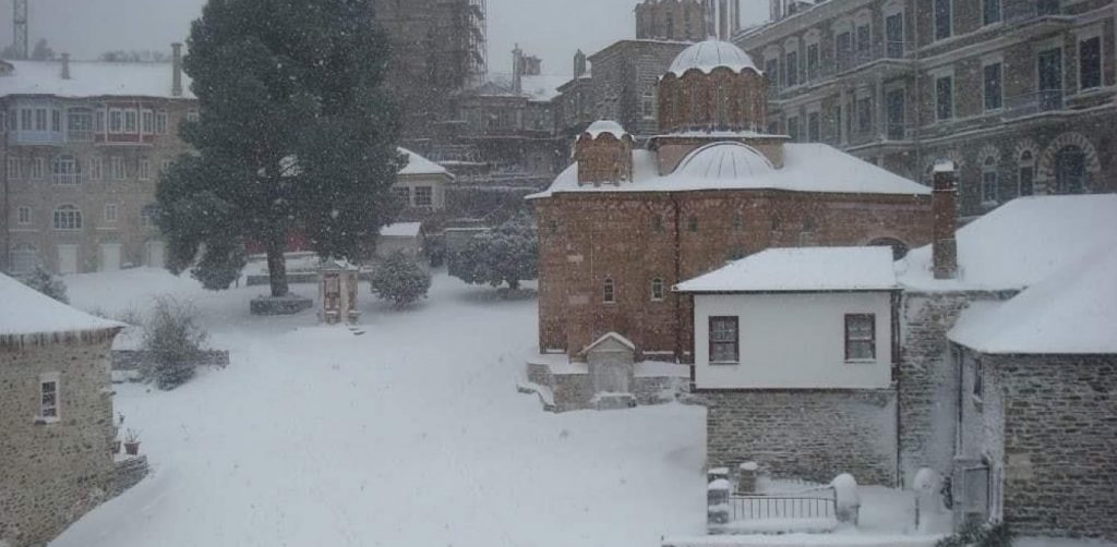 Πυκνές χιονοπτώσεις σημειώνονται ακόμα και σε παράκτιες περιοχές του Αγίου Όρους από το βράδυ της Κυριακής στην Αθωνική Πολιτεία. Προβλήματα παρουσιάζονται σε όλο το οδικό δίκτυο της Αθωνικής χερσονήσου, ενώ την Κυριακή δεν πραγματοποιήθηκαν τα δρομολόγια των πλοίων από Ιερισσό και Ουρανούπολη, καθώς ίσχυε απαγορευτικό απόπλου.