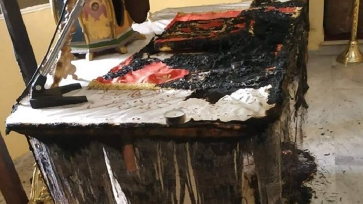 Σύμφωνα με τα όσα δήλωσε ο ιερέας του χωριού στην Αστυνομία, οι άγνωστοι παραβίασαν το μικρό παράθυρο στα πλάγια του Ιερού και πέταξαν μέσα στον χώρο ένα στουπί από χόρτα με αποτέλεσμα να πάρει φωτιά η Αγία Τράπεζα.