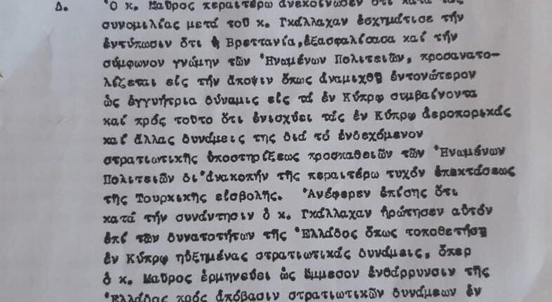 »Ανέφερεν επίσης ότι κατά τη συνάντηση, ο κ. Κάλαχαν ηρώτησεν αυτόν επί των δυνατοτήτων της Ελλάδος όπως τοποθετήση εν Κύπρω ηυξημένας στρατιωτικάς δυνάμεις, όπερ ο κ. Μαύρος ερμηνεύει ως έμμεσον ενθάρρυνσιν της Ελλάδος προς απόβασιν στρατιωτικών δυνάμεων εν Κύπρω με πιθανήν αεροπορική κάλυψιν του Ενωμένου Βασιλείου. Εις τοιούτο ενδεχόμενον ο κ. Μαύρος απεκάλυψεν ότι η Ελλάς προτίθεται να τοποθετήση δυνάμεις μιας επιλέκτου μεραρχίας».