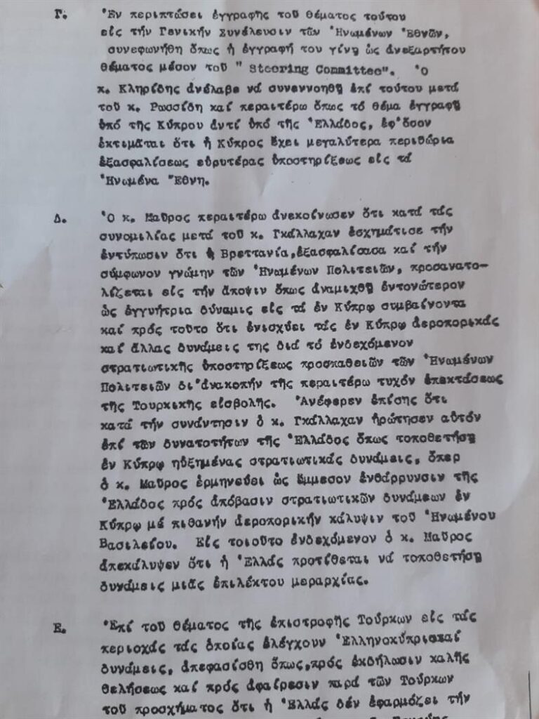 »Ανέφερεν επίσης ότι κατά τη συνάντηση, ο κ. Κάλαχαν ηρώτησεν αυτόν επί των δυνατοτήτων της Ελλάδος όπως τοποθετήση εν Κύπρω ηυξημένας στρατιωτικάς δυνάμεις, όπερ ο κ. Μαύρος ερμηνεύει ως έμμεσον ενθάρρυνσιν της Ελλάδος προς απόβασιν στρατιωτικών δυνάμεων εν Κύπρω με πιθανήν αεροπορική κάλυψιν του Ενωμένου Βασιλείου. Εις τοιούτο ενδεχόμενον ο κ. Μαύρος απεκάλυψεν ότι η Ελλάς προτίθεται να τοποθετήση δυνάμεις μιας επιλέκτου μεραρχίας».