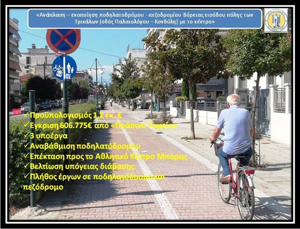 Ανήμερα της γιορτής του Αγίου Δημητρίου, στις 26 Οκτωβρίου 2020, το «Πράσινο Ταμείο» γνωστοποίησε την έγκριση των 606.775 € για το έργο με τον τίτλο «Ανάπλαση – ενοποίηση ποδηλατοδρόμου – πεζοδρομίου Βόρειας εισόδου πόλης των Τρικάλων (οδός Παλαιολόγου – Κονδύλη) με το κέντρο».