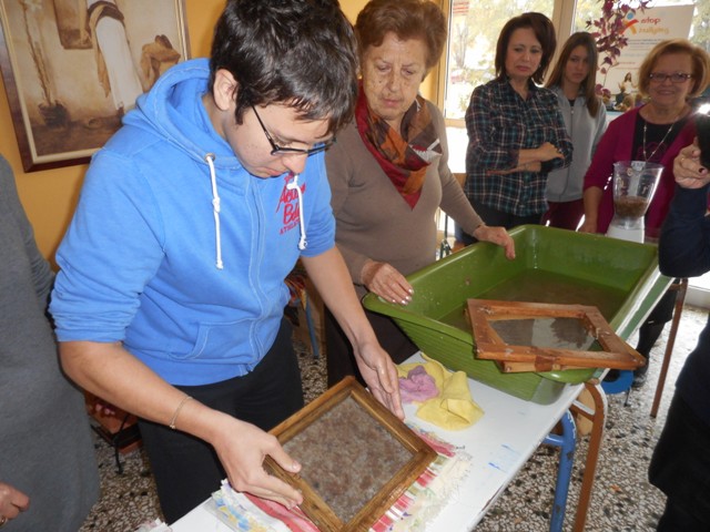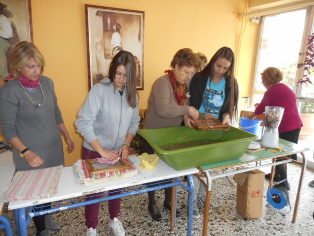 Η διαδικασία εκτάθηκε σε αρκετά στάδια. Αρχικά «μούσκεψαν» το χαρτί προς ανακύκλωση σε έναν κουβά με νερό. Στη συνέχεια έριχναν ποσότητες του μουσκεμένου χαρτιού σε μπλέντερ για πολτοποίηση και τον πολτό σε μεγάλη λεκάνη γεμάτη με νερό. Από εκεί με ειδικά πλαίσια συγκεκριμένου σχήματος με σίτα αφαιρούσαν ποσότητες . Ακολουθούσε ο πωματισμός για καλύτερη αποστράγγιση του νερού και τέλος επικόλληση σε λεία επίπεδη επιφάνεια για να στεγνώσει το ανακυκλωμένο πλέον χαρτί. Η όλη διαδικασία ενθουσίασε μαθητές και καθηγητές , που ενδιαφέρθηκαν να συμμετάσχουν σ’ αυτή. Ακολούθησε συζήτηση με τους μαθητές και καθορίστηκαν οι επόμενες κινήσεις για την χρησιμο0ποίηση του παραχθέντος χαρτιού για τις ανάγκες του προγράμματος.