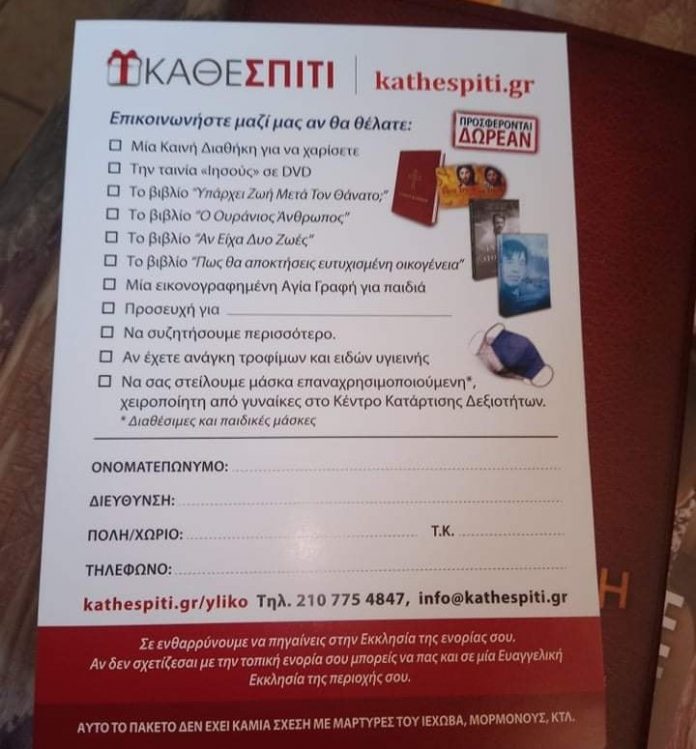 Άφησαν στις πόρτες των σπιτιών σακούλες που περιέχουν μία Καινή Διαθήκη και διάφορα φυλλάδια της ομάδας, στο πλαίσιο της προγραμματισμένης δραστηριότητάς τους με την ονομασία: «Operation Joshua-Κάθε σπίτι 2021» (Επιχείρηση Ιησούς του Ναυή- Κάθε σπίτι 2021). Οι καλοκαιρινές αυτές εξορμήσεις τους «ΚΑΘΕ ΣΠΙΤΙ» έχουν αρχίσει από το 2008.