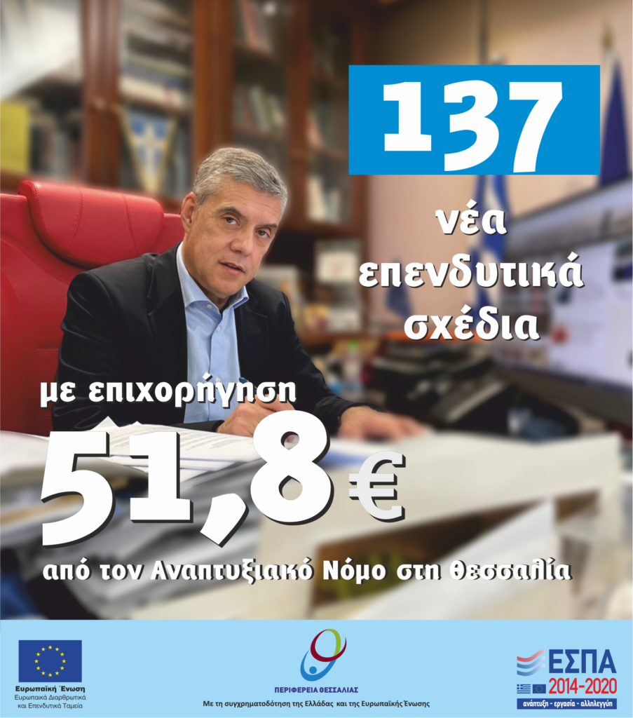 Ξεκινούν εκατόν τριάντα επτά νέα επενδυτικά σχέδια σε όλη τη Θεσσαλία, με συνολικό ποσό επιχορήγησης 51,8εκατομμύρια ευρώ από τον Αναπτυξιακό Νόμο. Ο Περιφερειάρχης Θεσσαλίας Κώστας Αγοραστός υπέγραψε τον Οριστικό Πίνακα Κατάταξης των επενδυτικών σχεδίων που υποβλήθηκαν στην Διεύθυνση Αναπτυξιακού Προγραμματισμού της Περιφέρειας και οδηγούν σε επενδύσεις συνολικού προϋπολογισμού109,2 εκατομμυρίων ευρώ. Πρόκειται για την υπαγωγή: