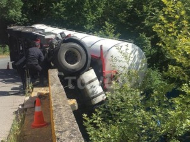 Το Βυτιοφόρο για άγνωστη αιτία εξετράπη της πορείας του με αποτέλεσμα να ανατραπεί και αφού σπάσει το στηθαίο της γέφυρας, η καμπίνα του οχήματος να βρεθεί στο κενό.
