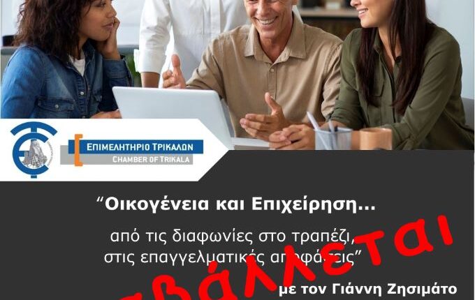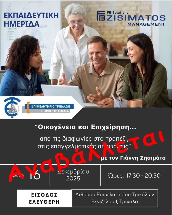 trikaladay.gr / Επιχειρηματικότητα / Αναβάλλεται η εκπαιδευτική ημερίδα του Επιμελητηρίου Τρικάλων για την αποτελεσματική διοίκηση της οικογενειακής επιχείρησης