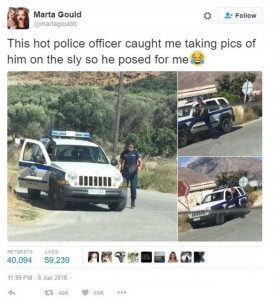 Η Μάρτα Γκουλντ έκανε διακοπές στη χώρα μας, όταν είδε το αυτοκίνητο με τον όμορφο αστυνομικό και αποφάσισε να τον βγάλει φωτογραφία. Ο ίδιος στην αρχή δεν κατάλαβε ότι τον φωτογραφίζει, αλλά όταν το αντιλήφθηκε της χαμογέλασε και τη χαιρέτησε.