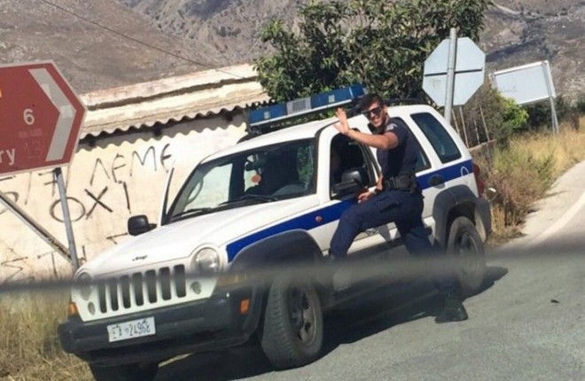 Ο νεαρός αστυνομικός, που βρίσκεται σε ώρα υπηρεσίας, όχι μόνο δεν ενοχλείται από τις λήψεις αλλά παίρνει και πόζα. Θαυμάστριες αναζητούν το στοιχεία του