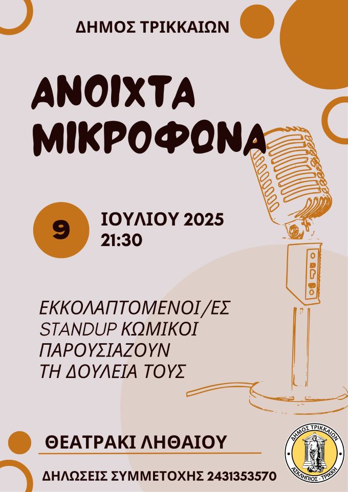 trikaladay.gr / Τοπικά / «Ανοιχτά Μικρόφωνα»: Ερασιτέχνες standup κωμικούς προσκαλεί για δημόσια παράσταση ο Δήμος Τρικκαίων