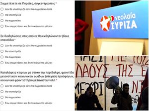 Σημειώνεται πως στο ερωτηματολόγιο που έχει αναρτήσει στην ιστοσελίδα της η νεολαία του ΣΥΡΙΖΑ, εν όψει του 1ου συνεδρίου της, καλεί τους συμμετέχοντες να απαντήσουν μεταξύ άλλων σε μία σειρά ερωτήσεων, όπως αν θα συμμετείχαν ή αν θα στήριζαν: