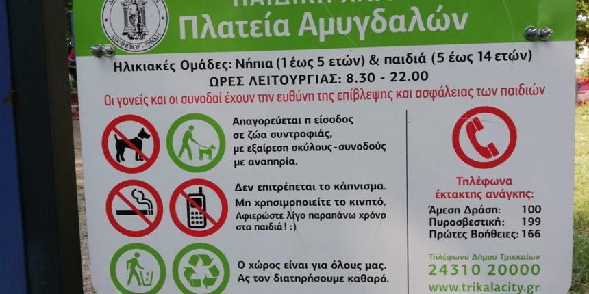 Μια πρωτότυπη ιδέα για τις παιδικές χαρές είχε ο Δήμος Τρικκαίων. Και την υλοποίησε με τις πινακίδες στις νέες, 40 πιστοποιημένες παιδικές χαρές που κατασκεύασε. Συγκεκριμένα, στις οδηγίες χρήσης που ανήρτησε, προτρέπει γονείς και κηδεμόνες να μην καπνίζουν και να μη χρησιμοποιούν το κινητό!