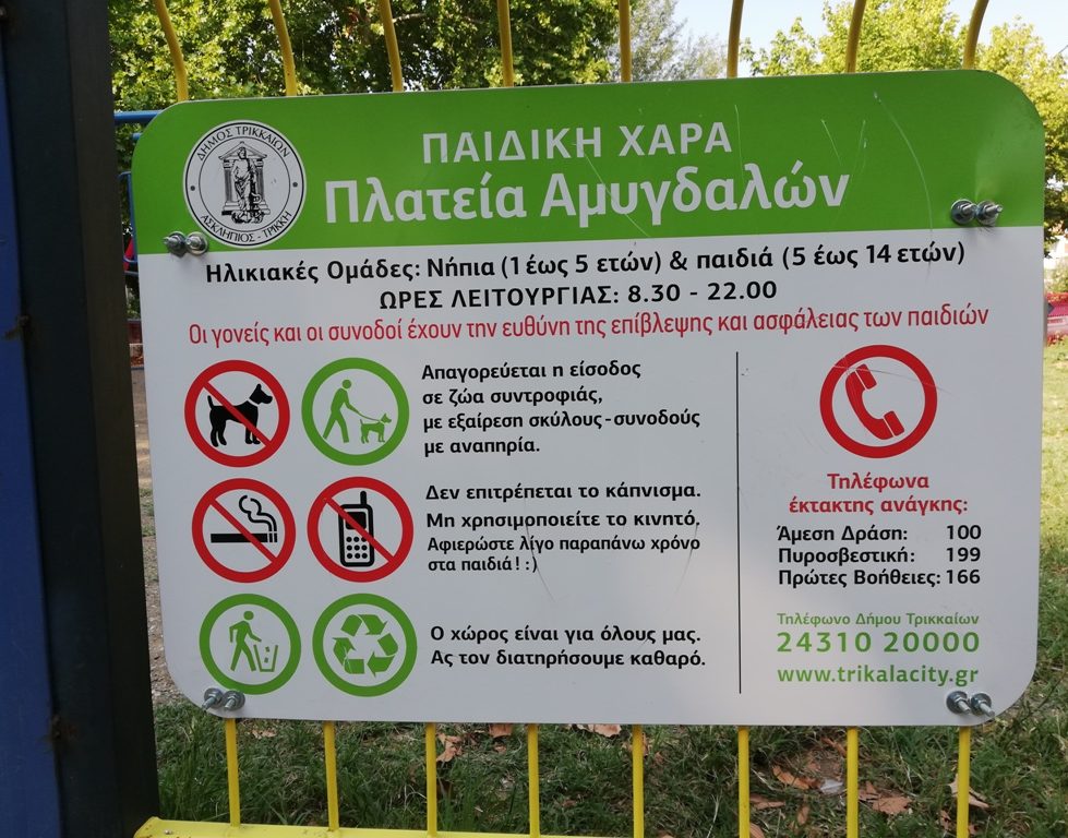 Οι πινακίδες τοποθετήθηκαν στις 40 πιστοποιημένες παιδικές χαρές που με δικά του χρήματα κατασκεύασε Δήμος Τρικκαίων, κυρίως στην πόλη των Τρικάλων και σε μεγαλύτερα χωριά. Επονται άλλες 40, σε περισσότερα σημεία της πόλης και σε χωριά, για να καλυφθούν οι ανάγκες των παιδιών σε μια πόλη που ευνοεί το παιχνίδι αλλά δίνει έμφαση στην ασφάλεια των παιδιών.